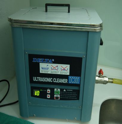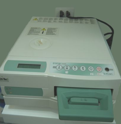 這台市價將近20萬的真空滅菌鍋用於一般大量器械的消毒,它的特色在於能完全乾燥,不會有傳統5 - 6萬的滅菌鍋,在消毒後器械仍然是潮濕的情形 ( 一般認為潮濕較易孳生細菌 ) 。