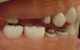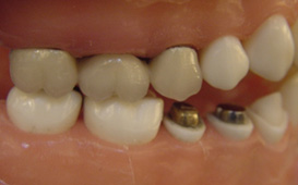 牙橋的好處是製作時間快,費用可能較節省 ( 因為材質不同而有不同 ) ,費用大約在兩三萬附近,若含黃金比例高有可能高達6 - 7萬元 ; 但是缺點就是要修磨旁邊的牙齒,比較可惜,而且一旦是假牙,就終身是假牙,而重建的咬合也較差 ( 兩人做三人的工作 ) ,因為仍舊是少一個牙根,不過仍比不做好。
